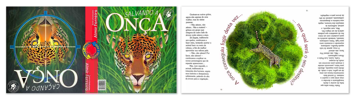 As ilustrações são um destaque à parte, elas não apenas acompanham o texto, mas o ampliam e comentam, traduzindo a atmosfera do Pantanal com cores, texturas e enquadramentos que valorizam a fauna, a paisagem alagada, os personagens humanos e, sobretudo, a imponência das onças. O traço é expressivo, comunicativo, com forte apelo para o leitor jovem, e mantém diálogo direto com o conteúdo educativo e ambiental da obra. Há cenas de grande impacto visual – como a onça na copa da árvore, vista em perspectiva superior – que funcionam como verdadeiros pontos de virada na narrativa e, ao mesmo tempo, como síntese poética do tema central do livro. Todo o conjunto – capa, miolo, tipografia, diagramação e ilustração – demonstra um cuidado editorial raro em projetos independentes, colocando “Salvando a Onça / Caçando a Onça” no patamar de obras de catálogo de grandes editoras, mas com a liberdade criativa e a identidade forte que caracterizam livros de autor.
